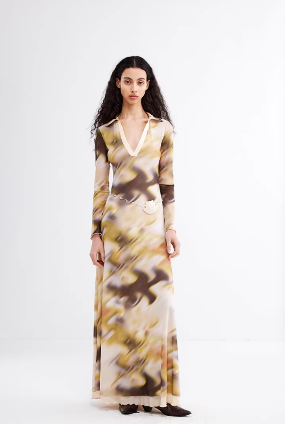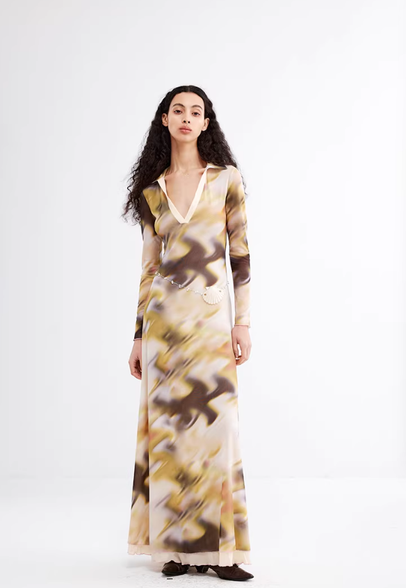 Ink Mirage – Abstract Print Double-Layer Bodycon Maxi Dress